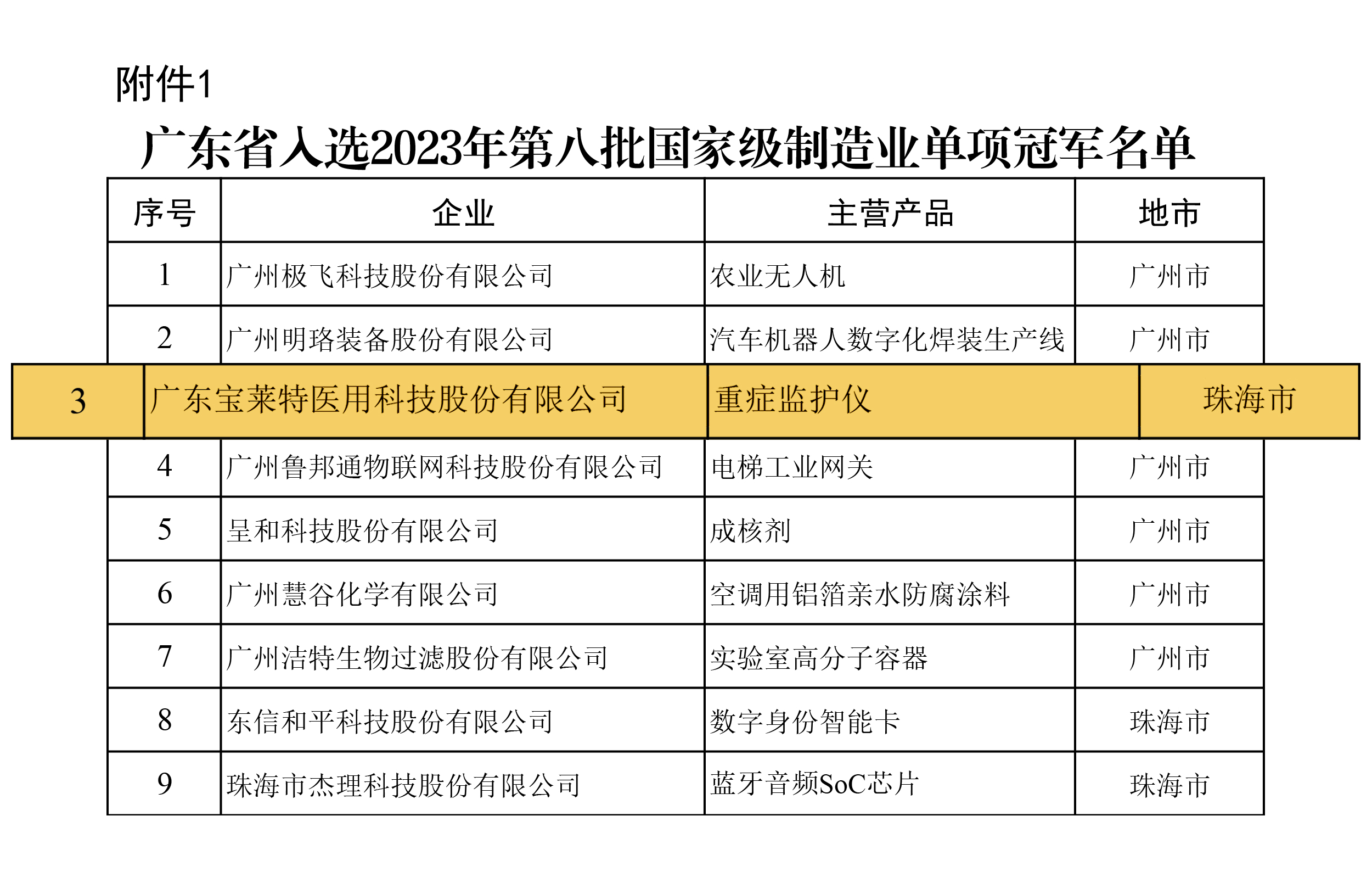 近日,廣東省工業(yè)和信息化廳公示了第八批國家級制造業(yè)單項冠軍企業(yè)名單,在這份備受矚目的名單中,廣東寶萊特醫(yī)用科技股份有限公司憑借其卓越的技術(shù)實力和市場表現(xiàn),獲得了國家級制造業(yè)單項冠軍企業(yè)的殊榮,這無疑是繼今年獲得省級單項冠軍后,政府對寶萊特在制造業(yè)領(lǐng)域的突出貢獻和成就的進一步肯定。