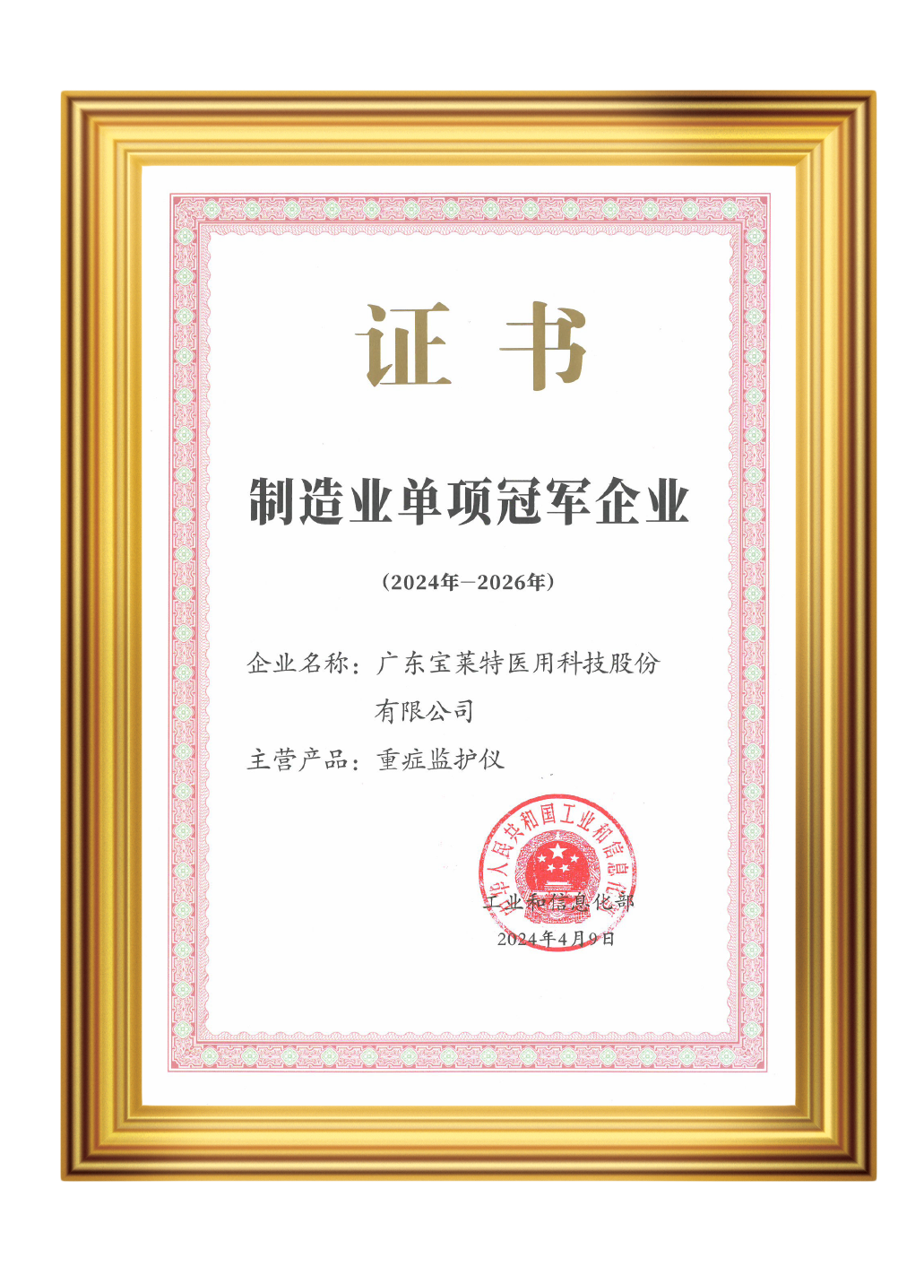 作為國內醫療器械老牌企業,多年來,寶萊特用長期主義給出了新質生產力的“寶萊特答案”。今年4月,廣東省工業和信息化廳公示了第八批國家級制造業單項冠軍企業名單,寶萊特榮獲國家級制造業單項冠軍企業獎項。