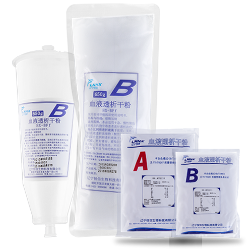 結構及組成:血液透析干粉由A粉、B粉組成。A粉成分為氯化鈉、氯化鈣、氯化鎂、氯化鉀、枸櫞酸;B粉成分為碳酸氫鈉。